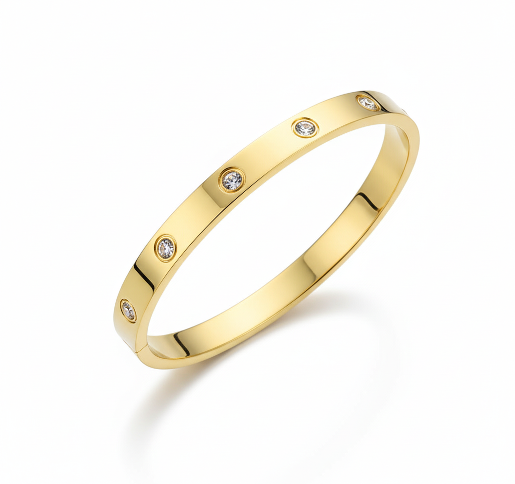 Add instant luxury to your wrist with the elegant Radiance Bangle. This bracelet features a sleek, high-polish band accented by six individually flush-set cubic zirconia stones, creating a brilliant, refined sparkle that is both captivating and durable. It’s a sophisticated piece that elevates any outfit, whether worn alone or as the foundation of your wrist stack.
