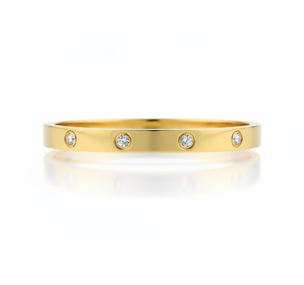 Design: A minimalist, classic bangle silhouette featuring six brilliant-cut diamond simulants, secured with a flush-set technique for a smooth, snag-free profile.
